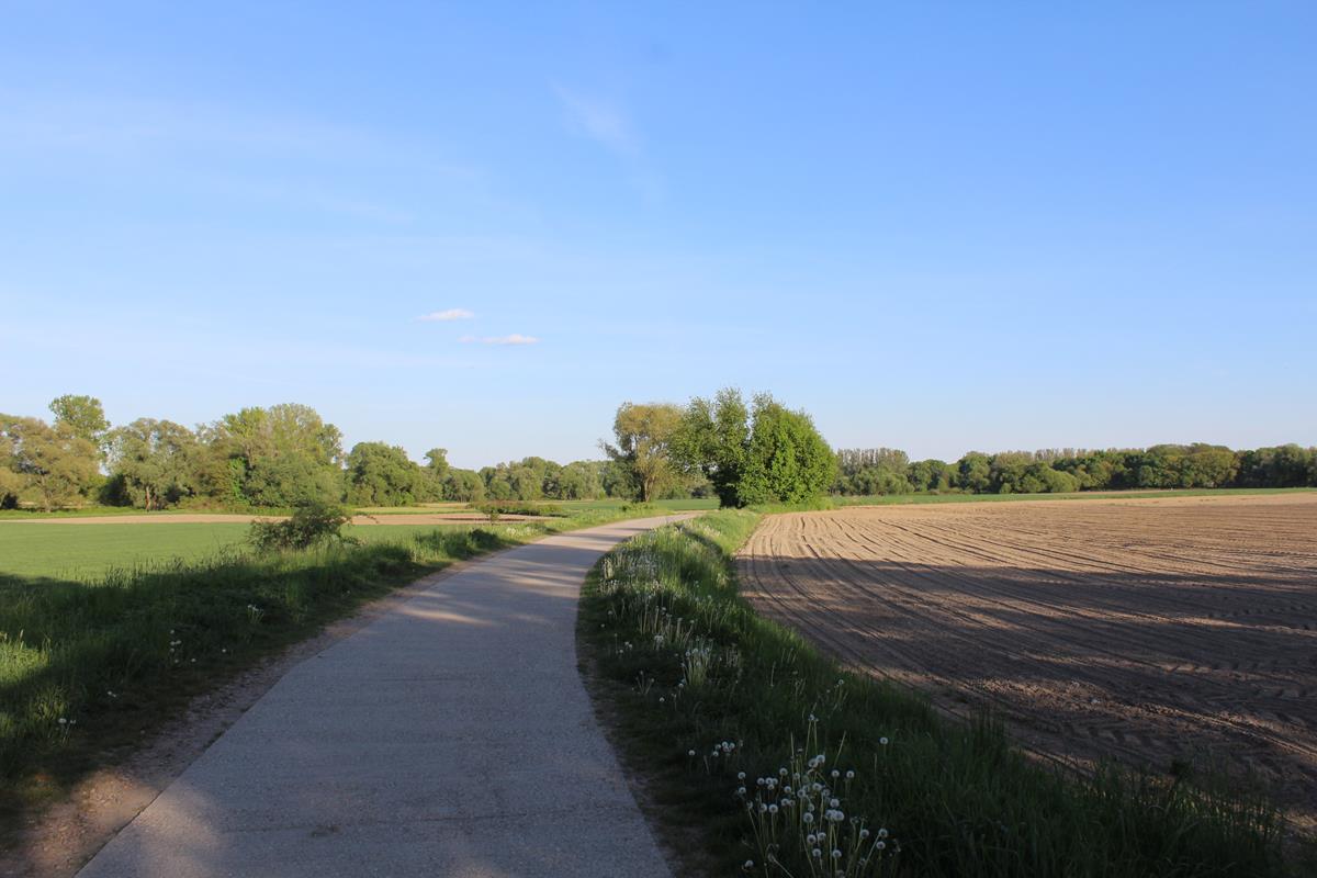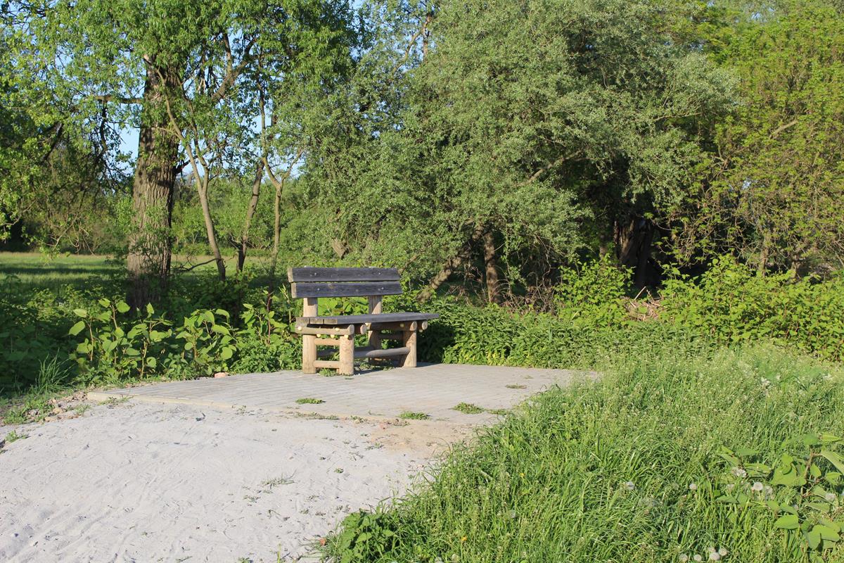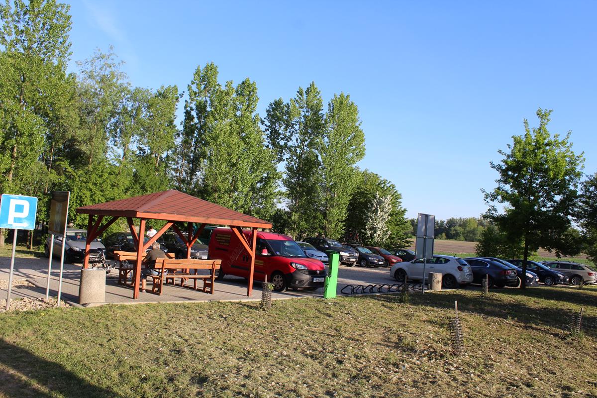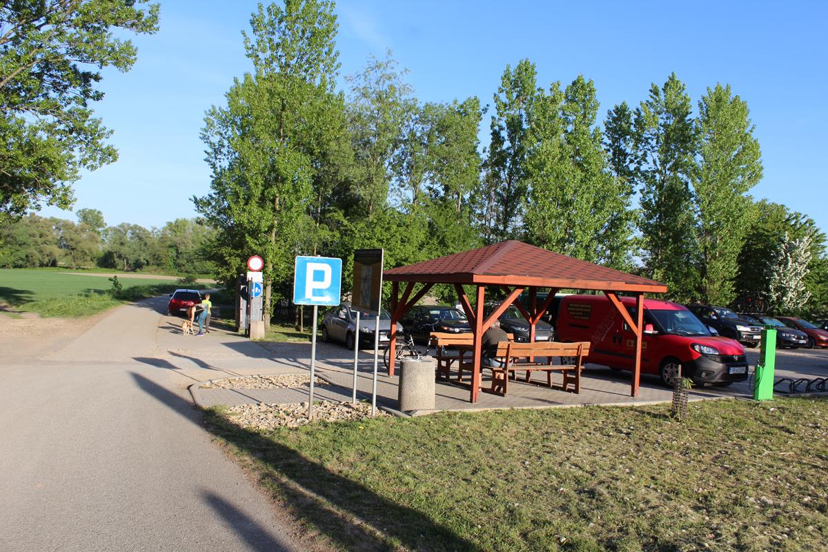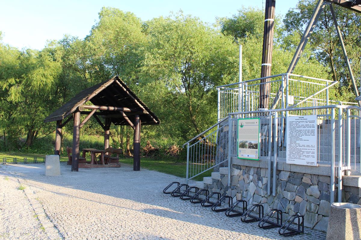 Przy parkingu znajdziemy drewniany domek gdzie można sobie odpocząć. Znajdziemy tutaj również wiele tablic informacyjnych jak np. tablica pokazująca wieżę jak i same Meandry. Znajdziecie również mapę pokazującą szlak rowerowy jak i pieszy na wieżę widokową. My idziemy pieszo, ścieżka jest wyłożona betonowymi płytami. Dojście do wieży widokowej z parkingu zajęło nam około 10 minut. W połowie drogi znajdziecie ławeczkę z punktem widokowym na pola.