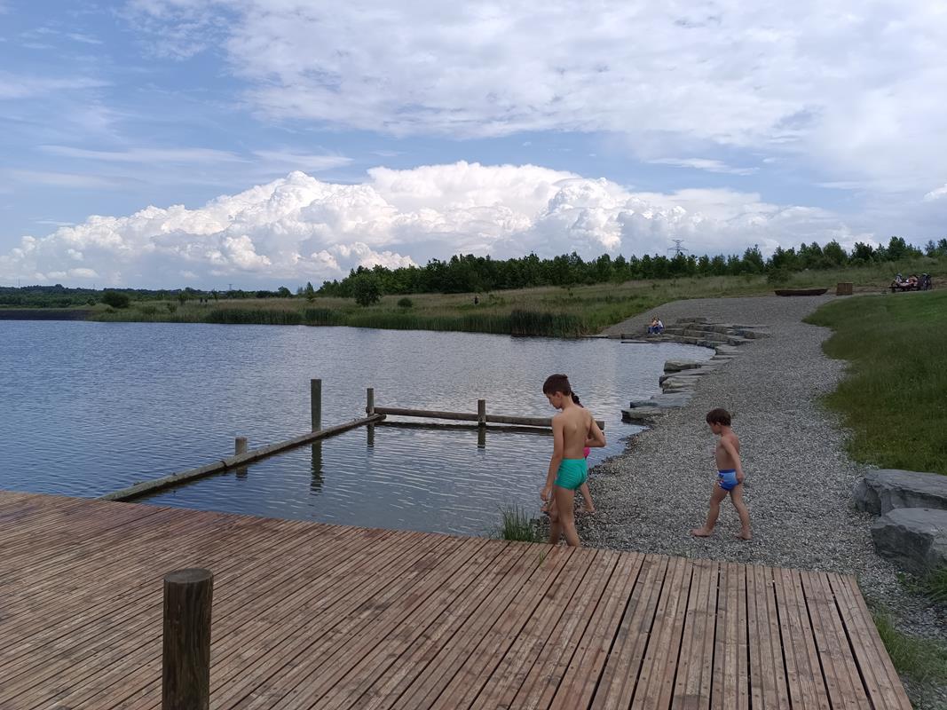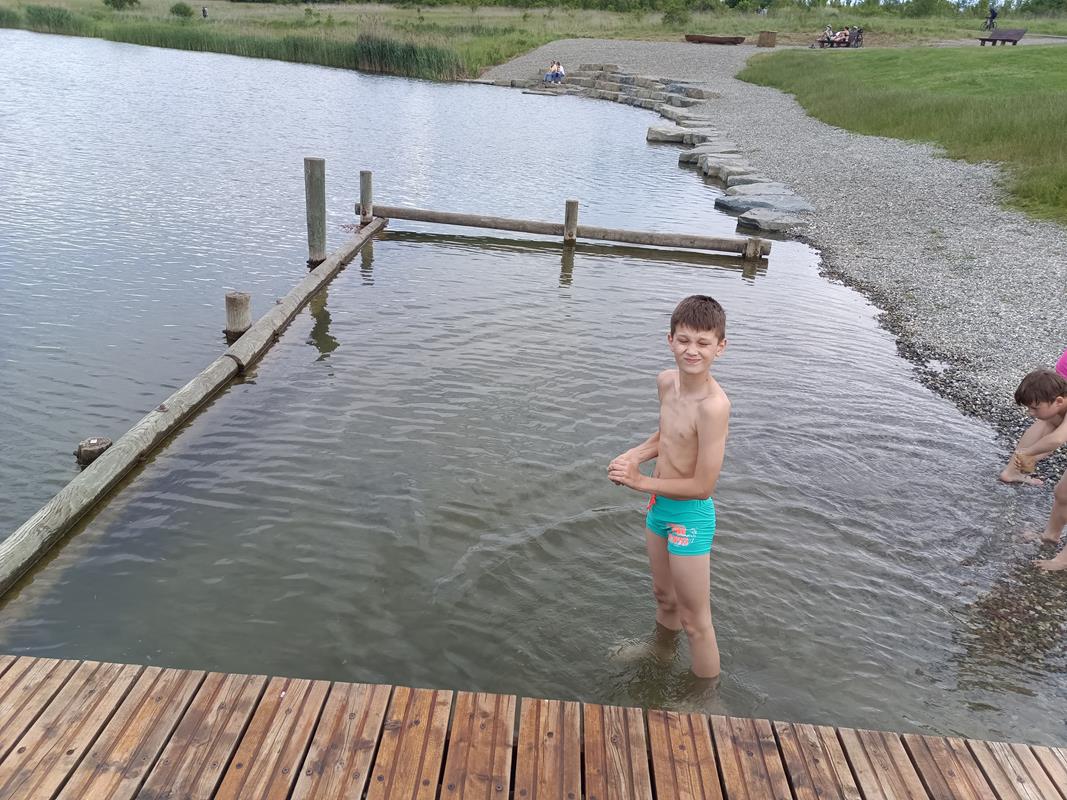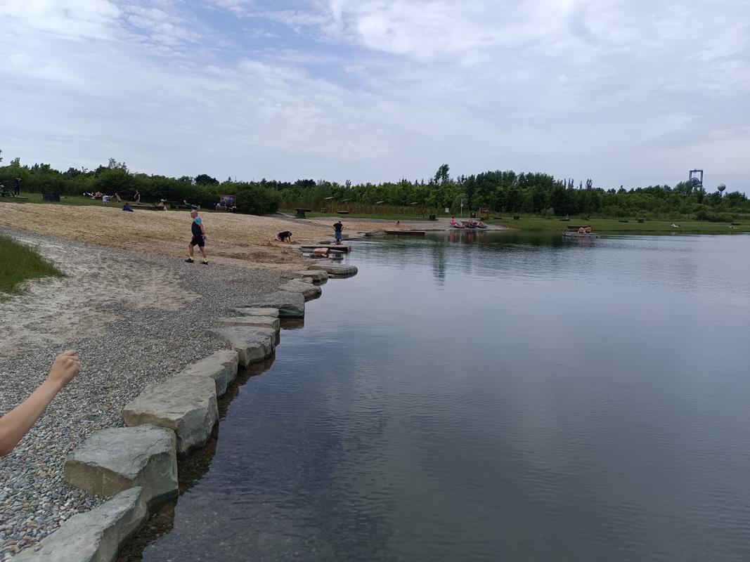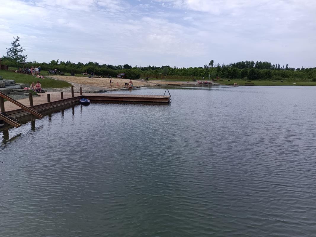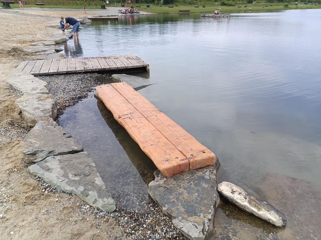 Teraz się wracamy i idziemy w kierunku plaży która się tutaj znajduje. Jest to miejsce gdzie znajdziemy wiele ławeczek, piaszczystą plaże, oraz kolejne molo. Nie zabrakło również brodzika dla dzieci. Nam jednak znowu spodobały się najbardziej drabinki z których można zejść do wody oraz pływające wyspy do których można dopłynąć i na nie wejść. Ciekawym pomysłem jest również drewniana ławeczka na której można usiąść i zanurzyć nogi w wodzie.